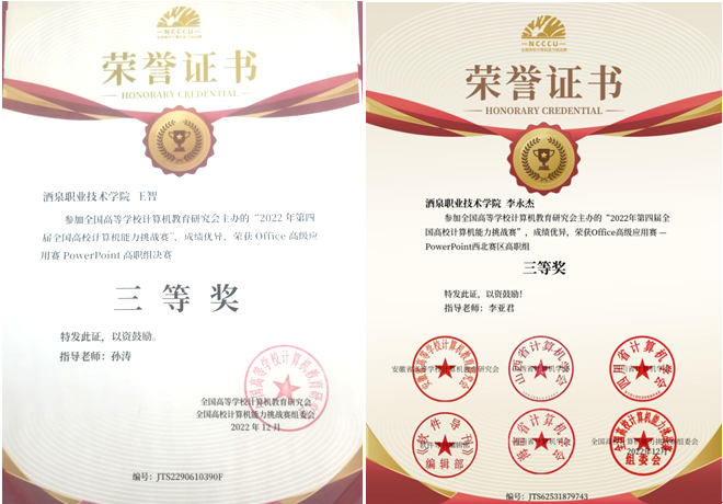 在学校的大力支持下,通过赛前培训、练习赛等多种形式组织学生认真备赛,2021级计算机应用技术1班学生王智成绩优异,荣获Office高级应用赛PowerPoint高职组决赛三等奖;2021级计算机应用技术1班学生李永杰获Office高级应用赛PowerPoint西北赛区高职组三等奖。我院教师孙涛、李亚君被评为优秀指导教师。