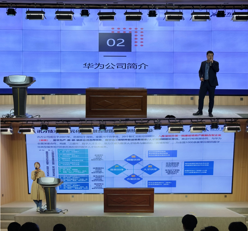 讲座上,张经理向大家介绍了华为公司的体系架构及人才需求情况;刘老师详细介绍了华为产学结合岗位体系,以及华为认证的HICE证书考取情况,并对学生未来可从事的相关职业及岗位需求进行了全面的讲解。