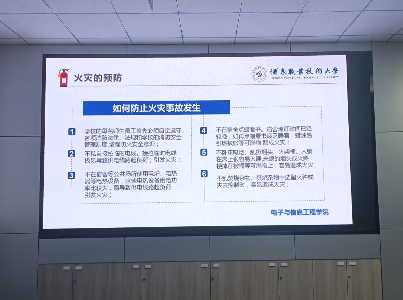 活动期间,学院采用了全方位、多角度的宣传教育方式。在弘毅楼一楼大厅,那块醒目的电子屏成为了消防安全知识宣传的重要阵地。它每天不间断地滚动显示着安全用火用电的温馨提示以及各类实用的消防知识,从火灾的成因、预防措施到火场逃生的正确方法,一条条信息清晰明了、生动形象,时时给过往的同学们敲响消防安全的警钟,让大家在潜移默化中增强安全意识。
