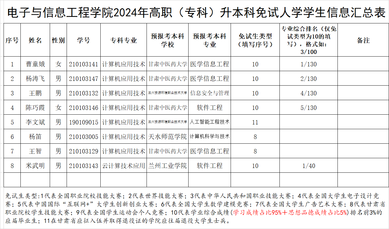 根据《2024年甘肃省普通高等学校高职(专科)升本科考试招生工作方案》(甘教学〔2023〕3号)、《2024年甘肃省普通高校高职(专科)升本科免试生招生工作实施方案》和《酒泉职业技术学院2024年高职(专科)升本科考试免试入学考生资格审定办法》相关要求,电子与信息工程学院对2024届应届毕业生在读期间专业综合测评排名前3%的学生、在甘肃省职业院校学生技能大赛中获得个人或团体二等奖以上的应届毕业生和在甘肃应征入伍,退役后在我院完成高职(专科)学业的甘肃省退役大学生士兵进行统计初审,经院务会审核通过,确定符合专升本免试资格条件学生8人,名单如下: