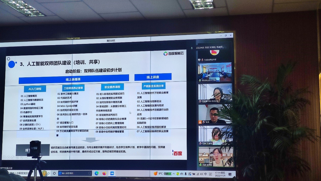 为进一步推进数据标注产业基地运营及人工智能产业学院建设,培养创新型的人工智能技术专业人才。11月4日下午,我院与百度公司通过线上线下视频会议形式举办了关于推进产业学院建设交流会。党委书记、校长易志军、党委副书记许军、副校长王立智等校领导出席会议。电子与信息工程学院全体领导及百度智能云团队参会。会议由百度智能云北区高级商务经理张洪主持。