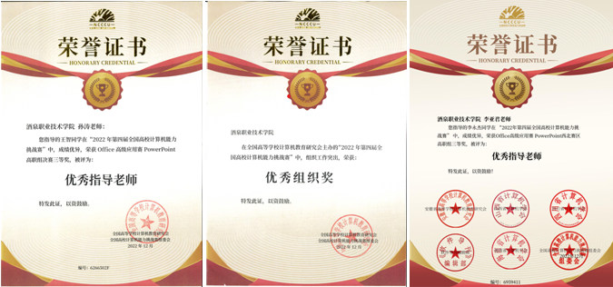 在学校的大力支持下,通过赛前培训、练习赛等多种形式组织学生认真备赛,2021级计算机应用技术1班学生王智成绩优异,荣获Office高级应用赛PowerPoint高职组决赛三等奖;2021级计算机应用技术1班学生李永杰获Office高级应用赛PowerPoint西北赛区高职组三等奖。我院教师孙涛、李亚君被评为优秀指导教师。
